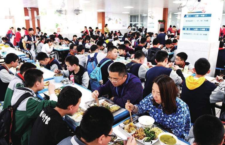 校长杨毅与几位老师拿着餐具排在队尾,值周老师初一年级组长阳义春、初三物理教研组长瞿瑛、美术老师李娇则在食堂内来回走动,查看孩子们的就餐情况。