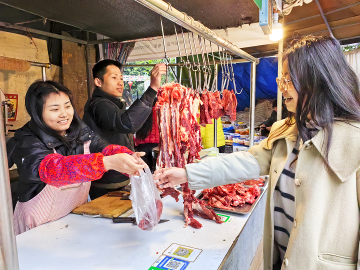 虽然刚营业那几天顾客不多,但从今年开始,很多居民成了谭鑫夫妻牛肉摊位的老顾客。“有些顾客提前预订我们的新鲜牛肉,有时候一大早牛肉就卖完了,我们还能提前休息。”谭鑫说,今年过年的时候生意最好,一天最多能卖400多斤牛肉,感觉在大渡口生活越来越有希望。