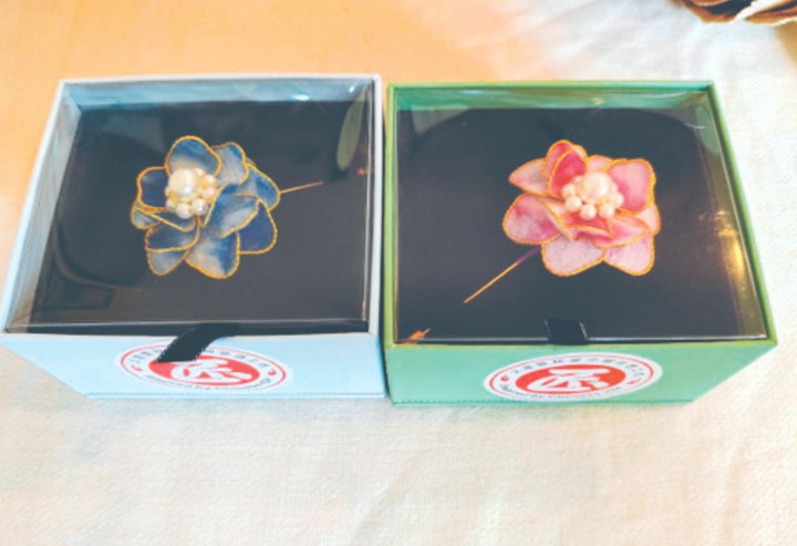 匠心生活(重庆)文化传媒有限公司大渡口分公司,该款胸针以重庆市花“山茶花”为原型设计,融合非遗扎染、掐丝、缠花三项传统技艺纯手工制作而成。