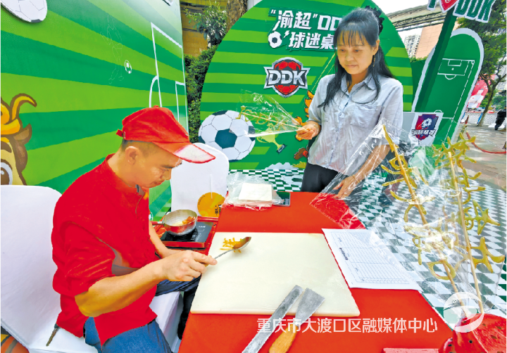 入口处,印着大渡口馨田战队参赛选手、教练的旗帜迎风招展,20处集市摊位依次铺开。大渡口非遗赵四四鲜米线摊位前,食客们端着招牌辣子鸡边吃边聊:“吃点辣的才够劲,看球更有激情”;南海地球村亲子乐园更是将后厨搬到场外,新鲜制作炒栗子、透着油光的卤鸭头、柴火玉米饼,吸引球迷纷纷购买品尝;球赛主题糖画区,老师傅握着长勺在石板上勾勒,不一会儿带着纹路的足球糖画就成型了,拿到糖画的球迷舍不得咬,先拍照发个朋友圈……