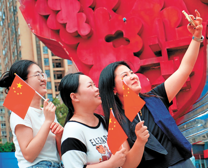 阿姨们来到区府广场,手持鲜艳的小红旗,身穿华丽礼服,向祖国献上诚挚祝福 朱晨鹭/摄