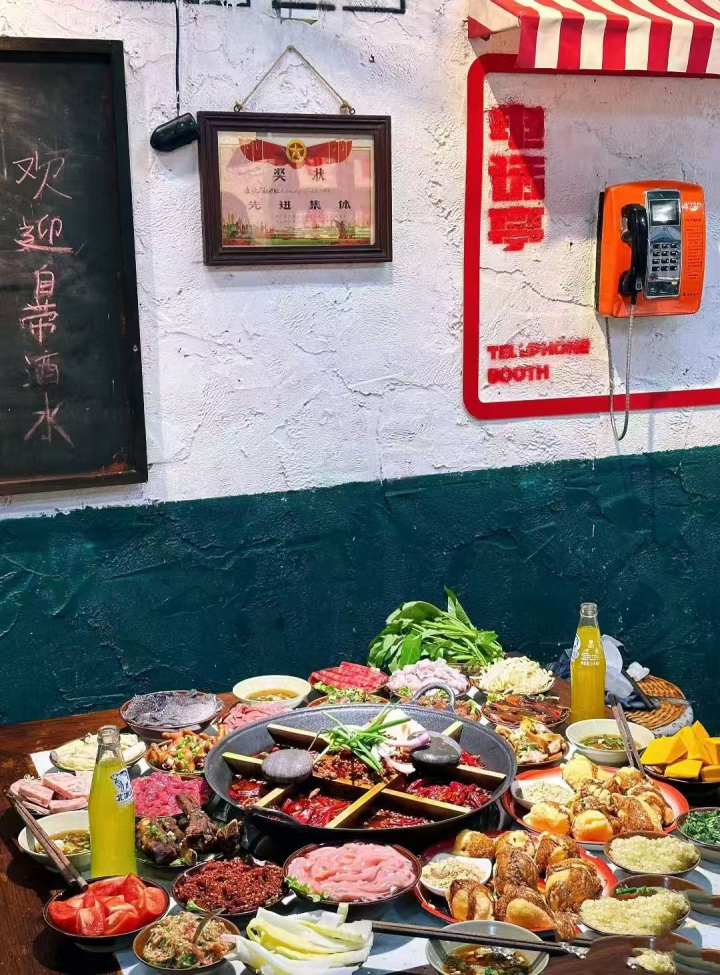 来到春晖路陶瓷市场旁的四车间老火锅,时光按下了倒退键,让人仿佛穿越到几十年前的重钢厂区。老式木制办公桌变身餐桌,工业老风扇在头顶缓缓转动,“安全生产”的泛黄黑板报、重钢老照片错落墙上,每一处细节都诉说着老重庆的工业故事。“我是重钢子弟,想让父辈的车间记忆在火锅里延续。”老板何俊辰的初心,让这家火锅店超越了单纯的餐饮属性,成为承载区域文化的“时光宝盒”。