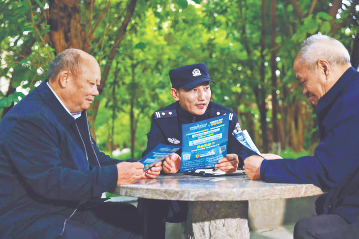 社区民警张晓可(中)为居民讲解防网络诈骗知识