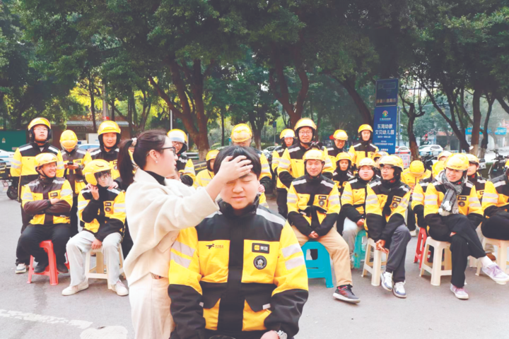 “刚学的肩颈按摩手法,正好缓解同伴送餐后的酸痛,这节‘志愿者课堂’太及时了!”12月1日,在大渡口区美团锦天站点,外卖骑手张强一边跟着康复培训学校老师练习按摩手法,一边笑着感慨。同一时刻,京东营业部里暖意融融,46名快递员和外卖员接过包含手套、暖宝宝的“暖冬温暖包”,区公安分局交通管理支队民警结合冬季配送出行特点,细致讲解骑行防滑、转弯避让等安全要点。这一幕幕暖心场景,正是大渡口区在第40个“国际志愿者日”之际,以志愿服务践行“奉献、友爱、互助、进步”志愿精神的生动注脚。