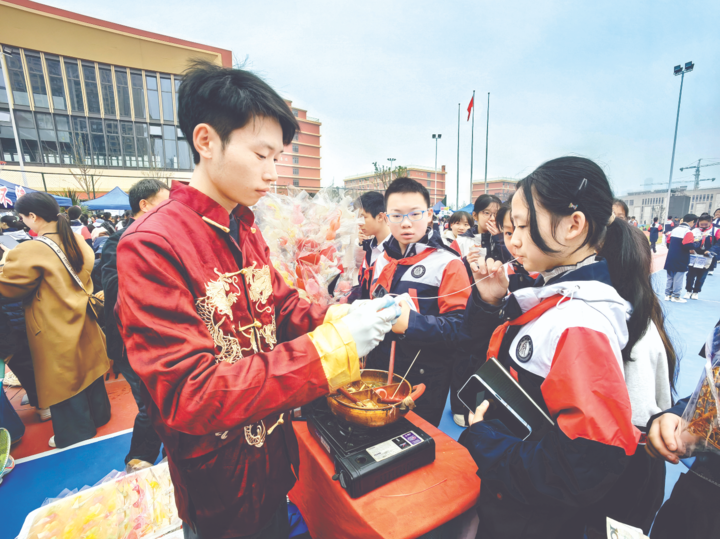当天,记者在“爱心易物”财商体验区域看到,30余个摊位整齐排列,琳琅满目的商品让人目不暇接。同学们化身“小老板”,带着闲置的书籍、文具、手工制品和文创产品热情售卖,摊位前讨价还价声此起彼伏。家长们走进校园,与孩子共同布置展台、吆喝揽客。七年级10班打造的“非遗市集”摊位格外热闹,60多种非遗文创产品整齐陈列,更有竹编、糖画等非遗传承人亲临现场展示技艺。“这场亲子互动不仅让孩子在实践中学会沟通和理财,还在携手合作中加深了亲子感情,为家校共育搭建了温馨的桥梁。”七年级10班学生于子博的母亲言语间满是认可,并期待能再次参与这样的校园活动。