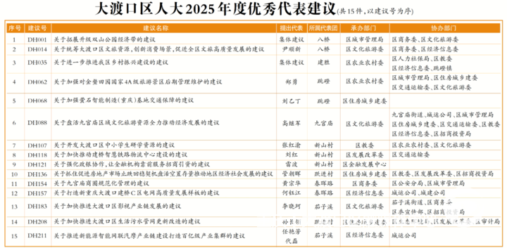 为总结经验、激励先进,促进代表建议质量进一步提高,经民主推选,区人大常委会主任会议研究,决定对《关于拓展升级双山公园经济带的建议》等15件优秀代表建议予以通报表扬。