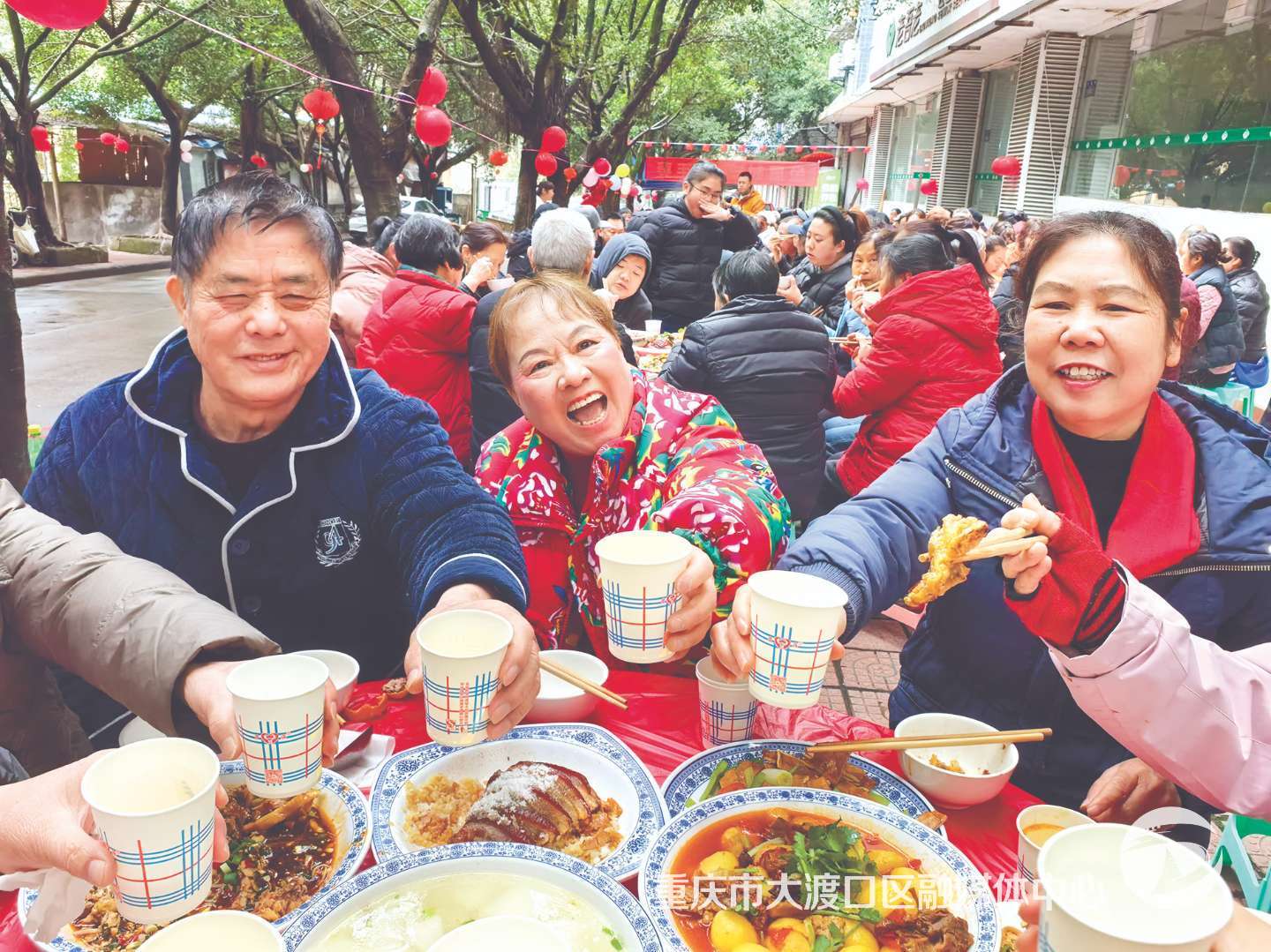 上午10点,居民们自编自导自演的文艺节目轮番登场,歌声、掌声、欢笑声此起彼伏。数十张圆桌整齐排列,邻里乡亲围坐一堂,座无虚席、暖意融融。清蒸肘子、夹烧肉、烧白、蒸鱼、回锅肉等一道道正宗重庆特色菜肴陆续上桌,复刻出老重庆“八大碗”的地道年味。