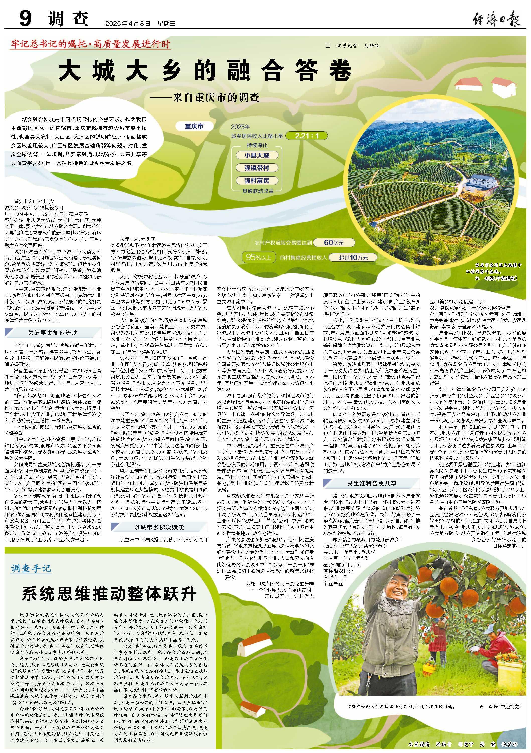 两年来,重庆牢记嘱托,统筹推进新型工业化、新型城镇化和乡村全面振兴,加快构建产业升级、人口集聚、城镇发展、乡村振兴的制度机制和政策体系,探索共同富裕新路径。2025年,重庆城乡居民收入比缩小至2.21∶1,95%以上的村集体经营性收入超10万元。